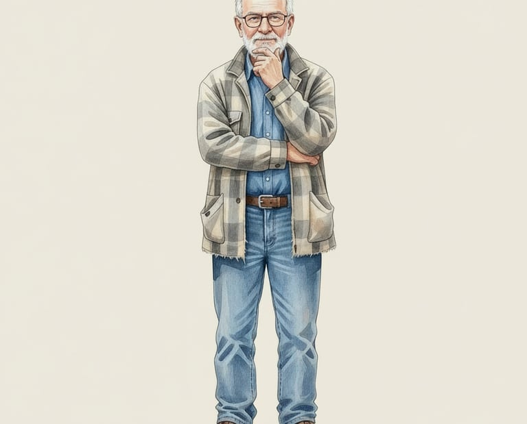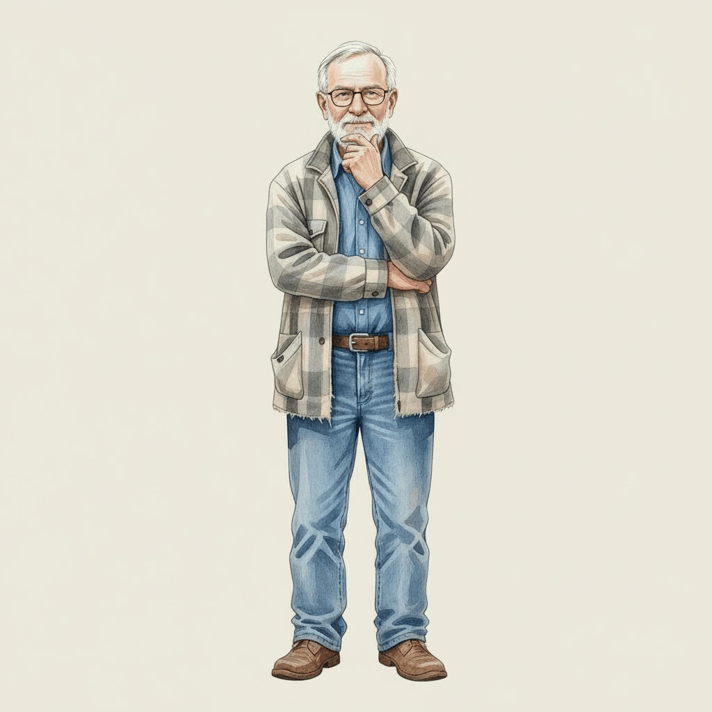 PopPop is 56 years old. He has a salt-and-pepper beard, glasses, and a torn plaid flannel jacket everyone calls his "old man jacket." He almost always has a coffee mug in his hand.